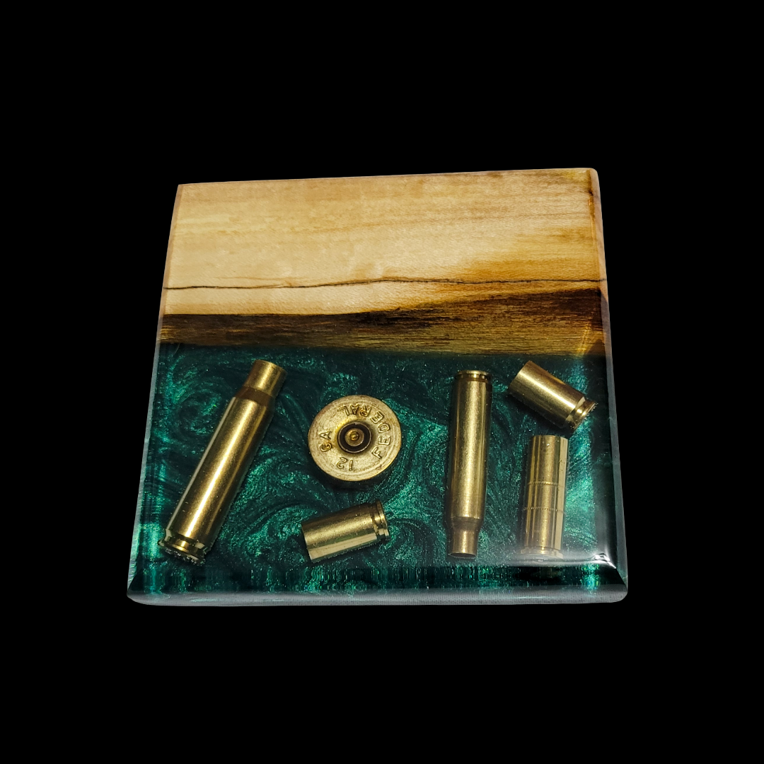 A variety of empty gun shells are inlaid in the resin. This is the perfect gift for any hunter or sharpshooter!