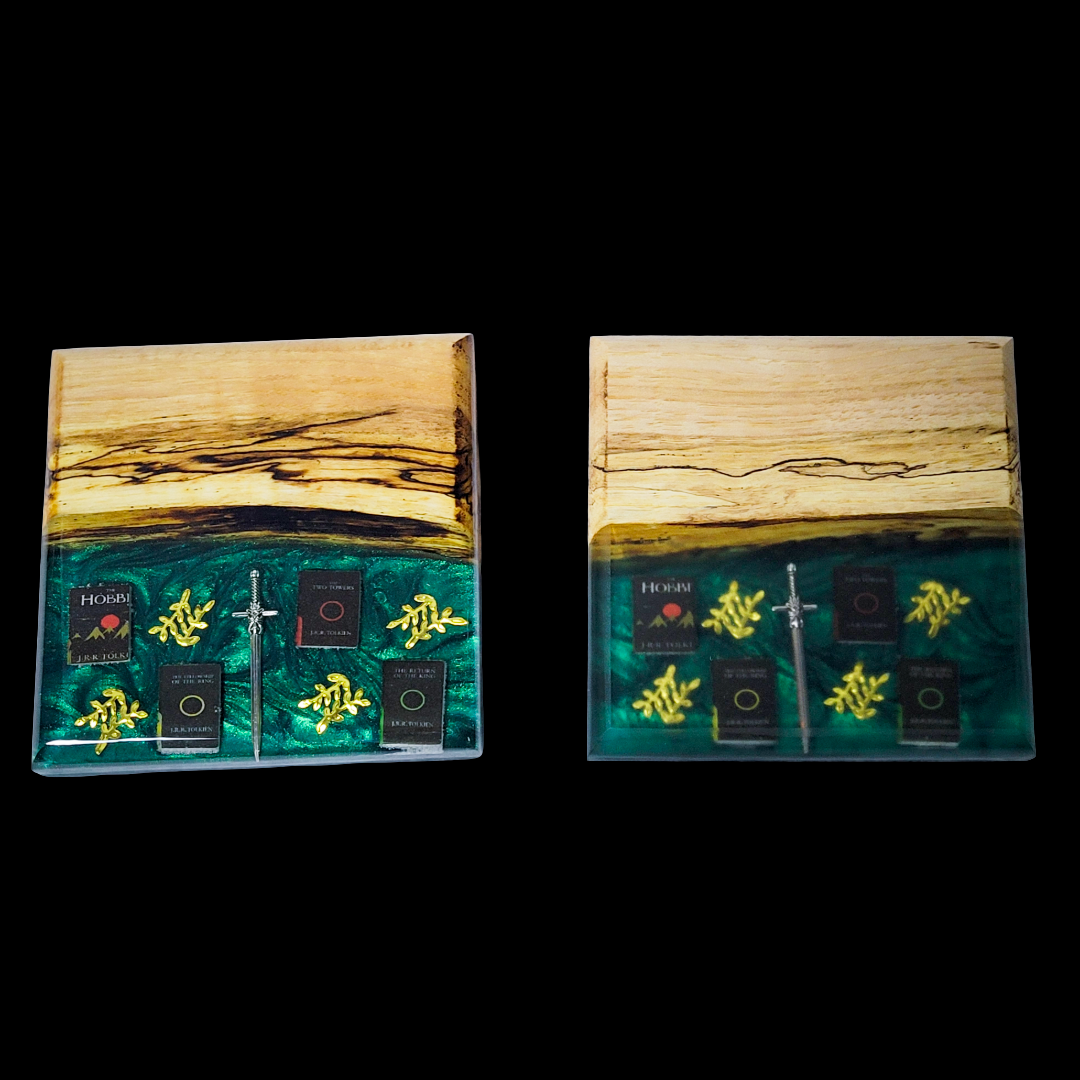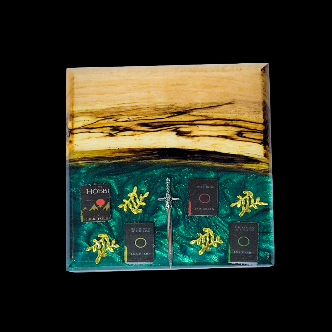Coffee coaster made out of reclaimed wood and epoxy resin featuring emerald green pigments swirled to embrace any cozy atmosphere. Miniature books from the Lord of the Rings series and a sword are inlaid in the resin. Imagine curling up on the couch with your favorite book and cup of hot tea on a rainy day. The perfect gift for any avid fantasy reader!