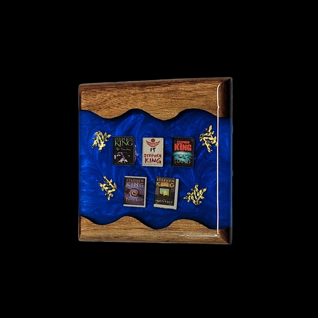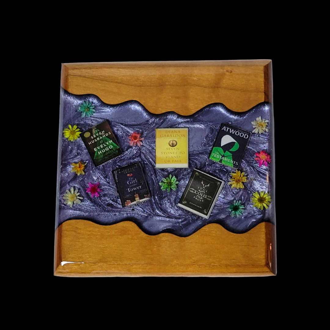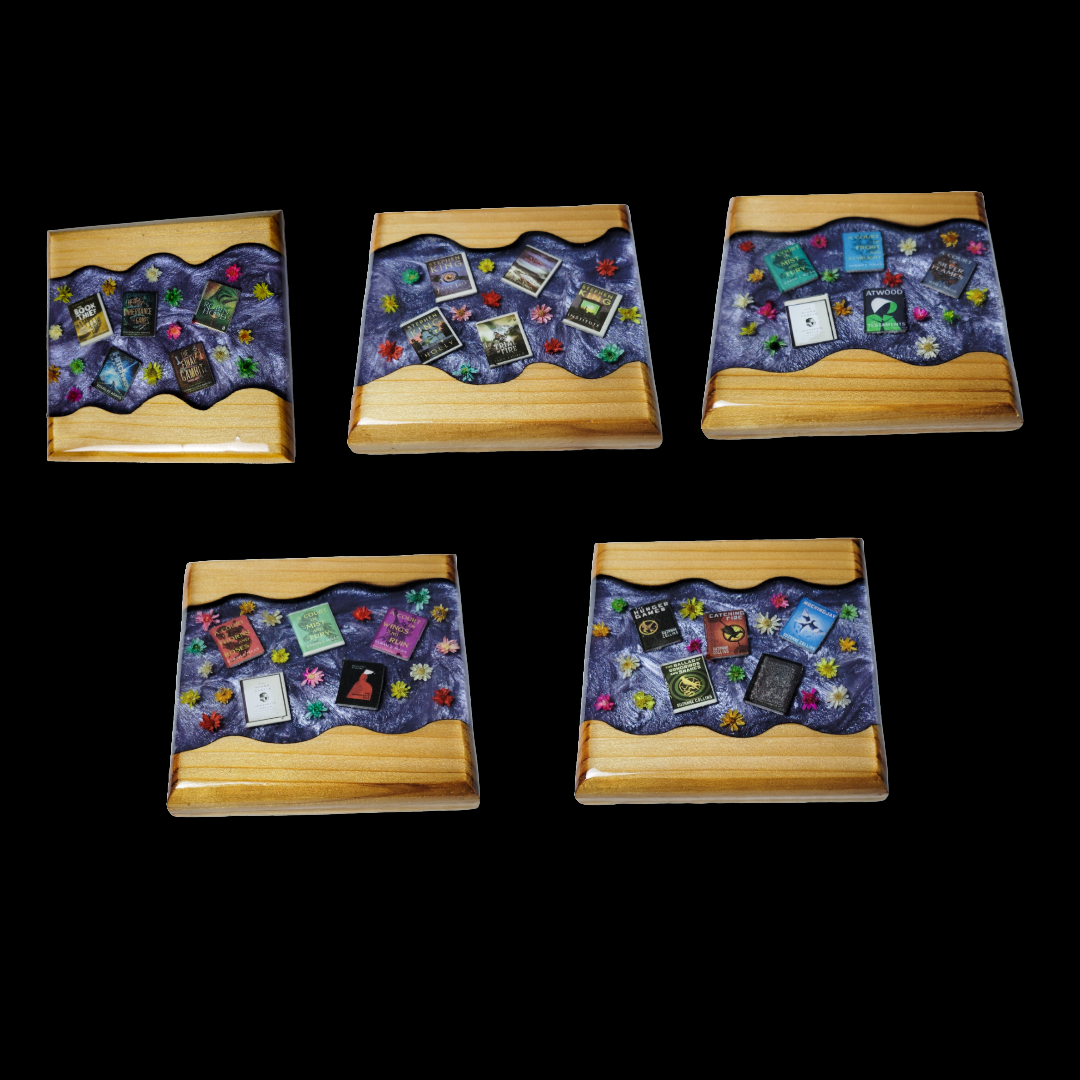 Coffee coaster made out of reclaimed wood and epoxy resin. Varients features golden purple rain and white pearl pigments or ultramarine blue pigments swirled together to embrace any cozy atmosphere. Miniature books and dried flowers are inlaid in the resin. Imagine curling up on the couch with your favorite book and cup of hot tea on a rainy day. The perfect gift for any avid reader!