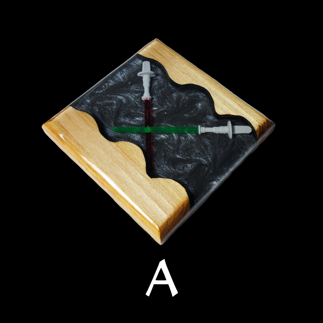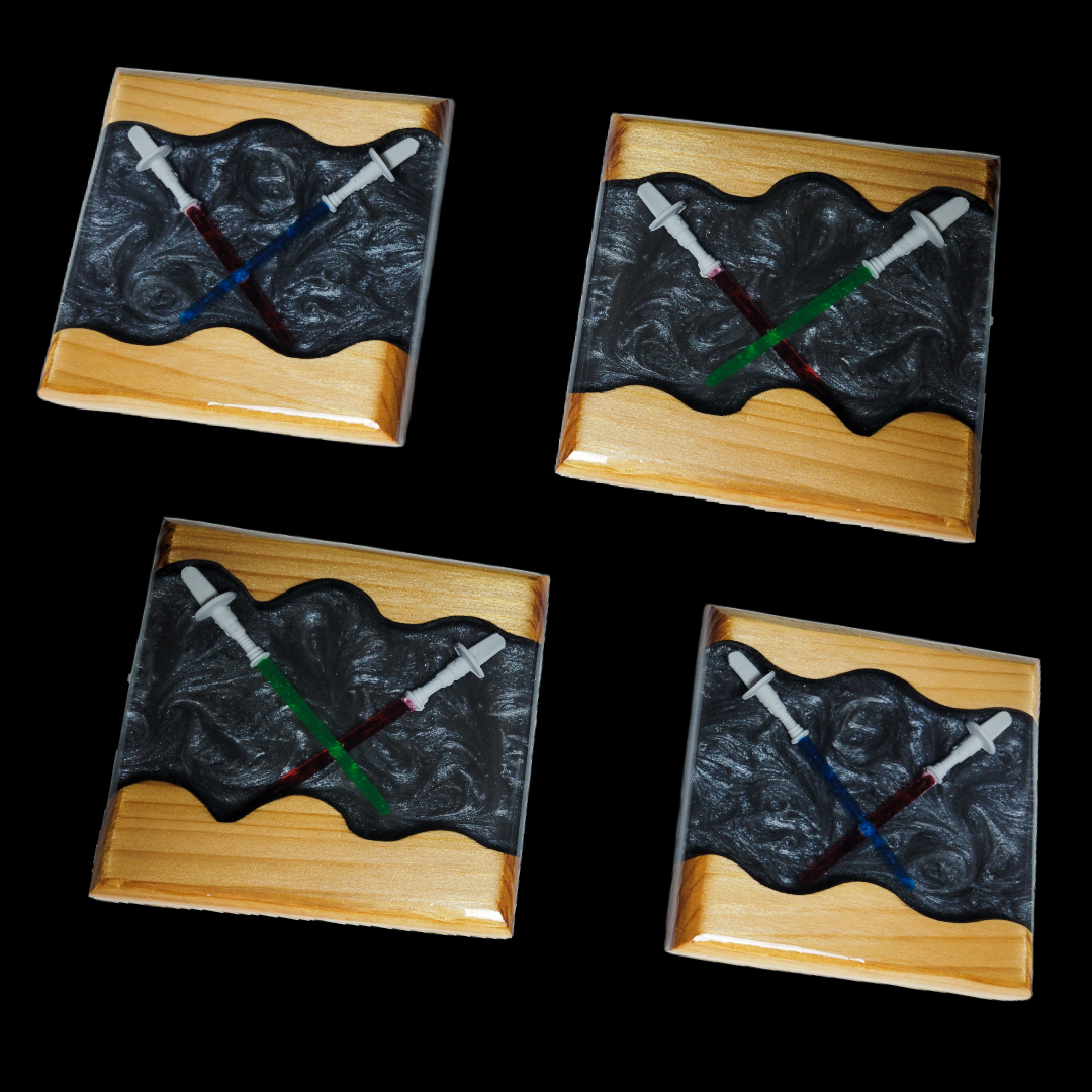 Coffee coaster made out of reclaimed barn wood and epoxy resin featuring a two light sabers crossing in an epic fight.The resin features diamond battleship grey pigments with a stunning design swirled into the resin, giving it the illusion the starships are flying through the galaxy. If the starwars theme song just popped into your head while looking at this, then this is definitely perfect for you! May the force be with you!