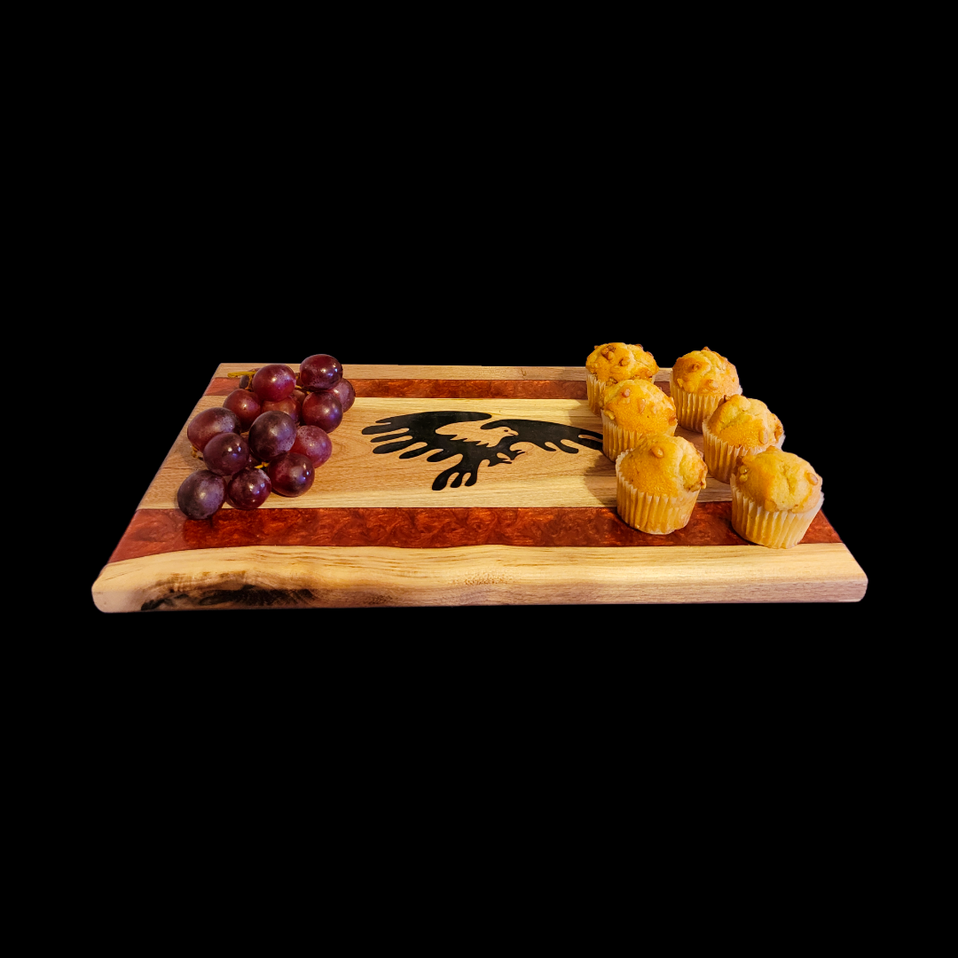 Charcuterie board made out of reclaimed wood and epoxy resin featuring an graceful eagle cut out on a scrollsaw in the middle of the live edge walnut wood. The resin features midnight blue and merlot red pigments, enhancing the patriotic theme of this charcuterie board. Several layers of N3 Nano wood finish has been applied to the coasters to provide the upmost protection against everyday usage. The charcuterie board is approximately 15.5x9x1 in size.