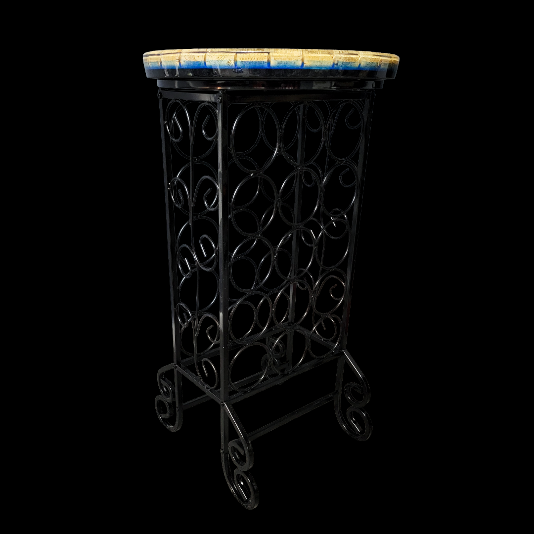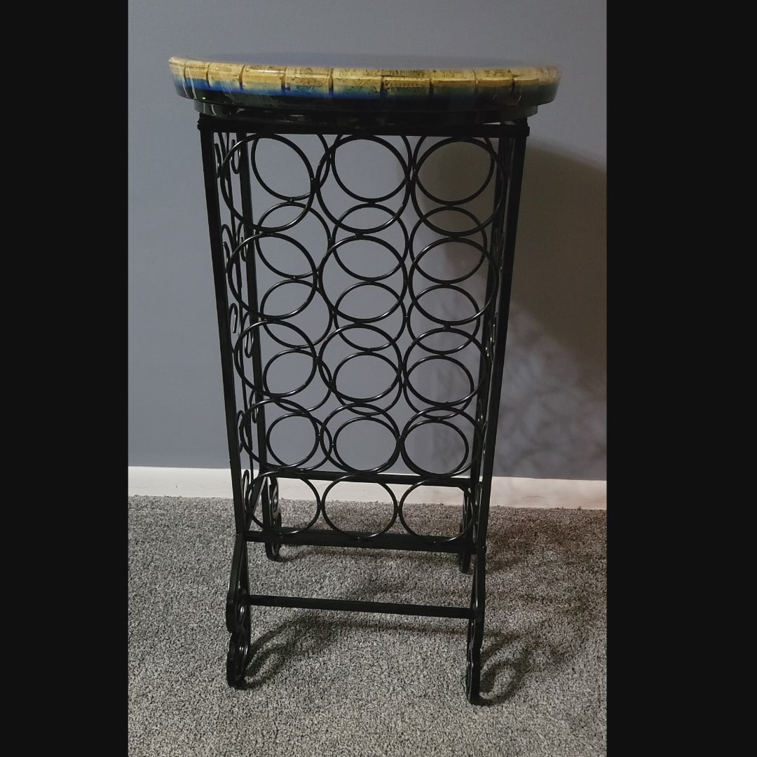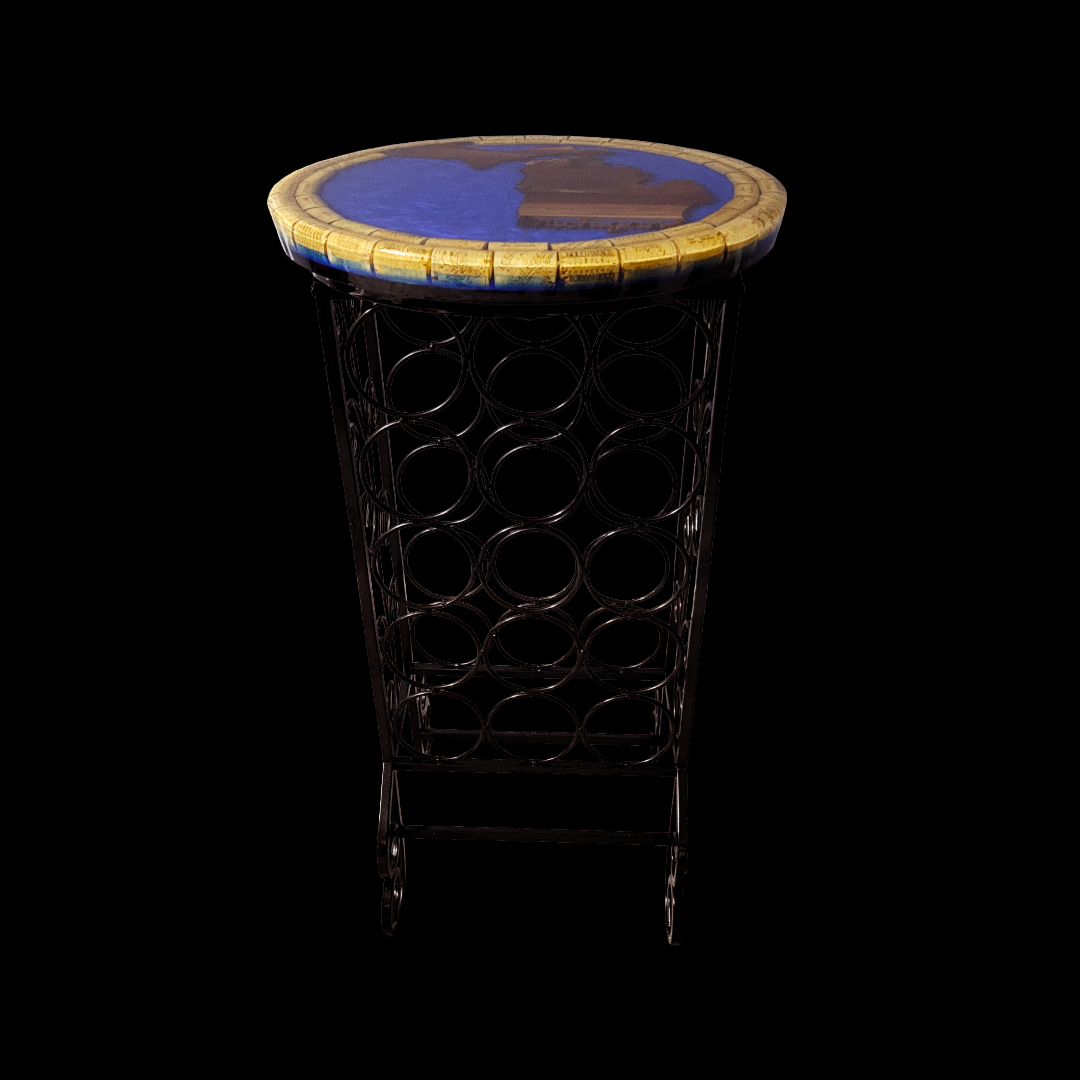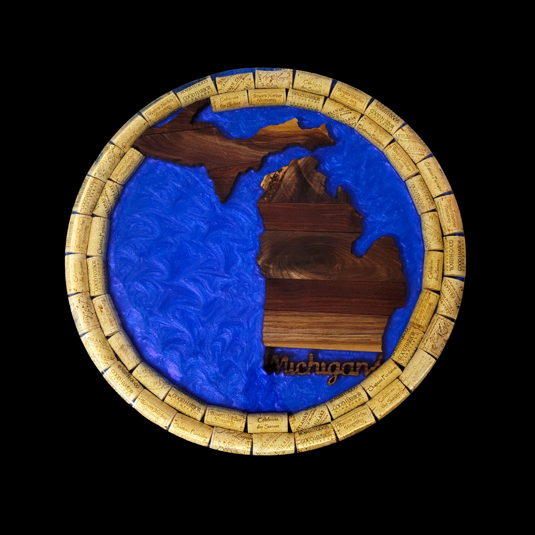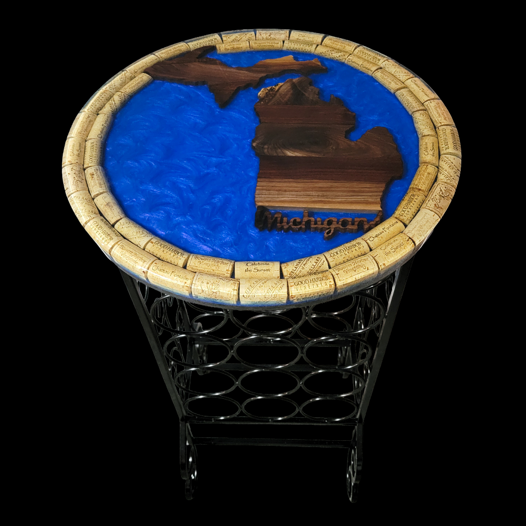 Original design bistro table, perfect for a cottage or cozy home. This table features a repurposed bistro table with a wine rack built into the base. The table top is a one of a kind hand made piece of art, featuring reclaimed walnut wood and resin combination with the state of Michigan delicately cut out on a scrollsaw. Authentic wine corks from local Michigan wineries complement the Michigan grown dark walnut wood. The resin features ultramarine blue pigments swirled together to resemble the great lakes surrounding this great state! If you're proud of the great lakes state and are looking for an original statement piece that's also functional, this is the piece for you. The table is approximately 18.5 x 18.5 x 34.5 inches in size.